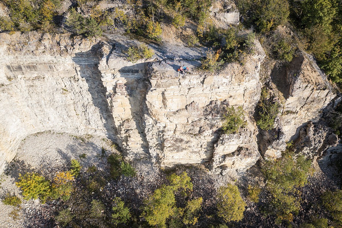 Im Altmühltal geht es jetzt zunächst am Ufer des Main-Donau-Kanals entlang. Kurz vor Dietfurt kehrt man der Wasserstraße den Rücken für einen Abstecher zur Mühlbachquelle, einer der größten Karstquellen der Altmühlalb. Der stille Quellteich verbirgt ein Geheimnis: Unterirdisch erstreckt sich hier ein riesiges Höhelnlabyrinth. Mehr darüber erfährt man direkt vor Ort in der Ausstellung „Stein.Wasser.Höhle“ im Steinstadel des Jurahaus-Ensembles Obermühle. Kurz hinter der Stadt Dietfurt führt die Route wieder ans Altmühlufer. Wie eine Insel ragt der Arzberg aus dem Tal, geformt von Sulz und Urdonau. In einem ehemaligen Steinbruch bekommt man hier einen Eindruck von den übereinander lagernden Gesteinsschichten.