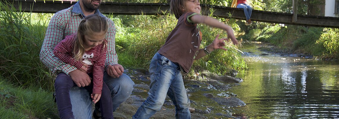 Wir gehen geradeaus weiter am Sportheim vorbei und sehen auf der linken Seite die herrlich blau schimmernde Sollachequelle. Wissenswertes über die Quelle erfahren wir hier auf einer weiteren Tafel. Ein gemütlicher Ruheplatz lädt zum Verweilen ein. Nach einer kurzen Rast laufen wir weiter um die Sollachequelle herum und kommen an den Sportplatz. An verschiedenen Outdoorfitnessgeräten kann man sich nach Lust und Laune sportlich betätigen. Wir gehen weiter zurück Richtung Ortsmitte und kommen an die Furt. Durch die Furt zu laufen ist an heißen Sommertagen eine erfrischende Abkühlung für die Beine. Der Weg führt uns weiter zurück zur Ortsmitte. Im Ort angekommen kann man noch einmal auf einer Sitzgruppe die Ruhe am Wasser genießen.
